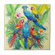 Ceramic tile in vividly colored tropical birds surrounded by lush green foliage and vibrant flowers. The birds display brilliant shades of red, blue, yellow, and green. The scene depicts exotic beauty and rich botanical detail.