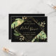 Den här eleganten tropiska temat inbjudningskort för möhippan har exotiska löv med guld-accenter i svart bakgrund. Ett modernt geometriskt guld ram belyser texten från guld. Guld stänk accentuerar den botaniska utformningen och gör att stollig blir lite sofistikerat på inbjudan. Denna öoas inbjudan är perfekt för all möhippa utomhus, på strand eller på bestämmelseorten.