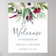 Den tropiska brons välkomna poster bröllop är perfekt för en elegant vår eller sommar bröllop. Blommigten är utformad med röda, burglösa, och vita blommor på en säng av vattenfärgade eukalyptus och tropiska grejer med en avslappnad hawaiisk känsla. Anpassa poster till namn på bruden och trimmen och datumet för bröllop.