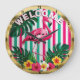 Denna sjudande runda tidspunkt ger ett soligt Aussie-välkomnande med ett tropiskt fläkt. En slående rosa flamingo står på ett skoningslöst sätt mot en bakgrund av rosa och lodrät rand med skiftande turkos. Lush grönt monstera löv och färglösa hibiscus blommor i rosa, rött och gult ram flamingo. Den fetstilta "WELCOME" från ord samlas högst upp i rosa och vit text. Tidpunkten har ett glansigt ram med guld-ton, som lägger till en gnutta glamor till det här summerande australiska hälsning.