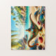 A jeweled genie lamp rests on sun-warmed sand, surrounded by colorful seashells and glowing coastal light. Turquoise waters, swaying palm trees, and smooth island rocks create a serene tropical backdrop filled with magic and possibility. The ornate details and vibrant colors invite you to imagine wishes waiting to be released beneath a clear blue sky. Perfect for fantasy lovers, beach dreamers, and fans of magical décor, this enchanting artwork makes a captivating jigsaw puzzle that offers both relaxation and a sense of wonder with every piece.