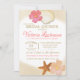 Söt tropiska korall och persikor Hibiscus blommor, stjärnfisk och stranden i sjöar och inbjudningskort för möhippan med koralltext och elegant typsnitt.