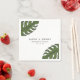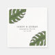 Modern napkin i bröllop har en enkel design med två stora löv i grönt handflatan, en i det övre lämnat hörnet och en i det nedre hörnet i högerna tillsammans med ditt namn, plats och datum, över en vit bakgrund. Den här tropiska designen är perfekt för ett sommarmålbröllop på stranden.