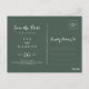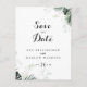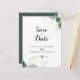 Den här tropiska grönaktiga vita blommigten sparar datumet som vykort är perfekt för ett målbröllop. Grönt handflatan lämnar buketter med vita vackra blommor.