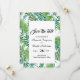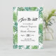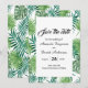 En elegant blommigt tropiskt grej sparar datumet för ett bröllop-kort. Mallar för datum för namn och bröllop. En elegant vit bakgrund, svart brev. Vattenfärgad grönt handflatan träd löv och löv som ram. Bakåt: Samma bakgrund som ram på framsidan.