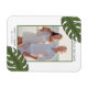 Tropiskt foto spara datum magneter med två stora gröntar illustrerade handflatan löv, en i det övre lämnat hörnet och en i det nedre hörnet av högerna och en ram runt ditt favoritlodrät bild, över en vit bakgrund. Den här designen är perfekt för ett sommardestinationsbröllop av en tropisk strand.