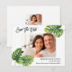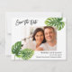 Det här moderna Rädda datumkortet har tropiska handflatan-löv på båda sidor av kortet och en bild av paret i mitten. Kortets baksida innehåller en mindre bild och ytterligare uppgifter om bröllop. Detta kort för elegant är perfekt för Vår eller sommar-Bröllop eller för Bröllop med tropiskt tema.