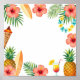 Vibrant tropical border frame bursting with watercolor hibiscus flowers in bright coral pink and sunny yellow, lush green palm leaves, juicy pineapple slices, classic surfboard, flaming tiki torch, refreshing pineapple cocktail with umbrella and straw, colorful lei garland, and fresh citrus accents.