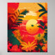 En levande solnedgång på en tropisk ö med reggae färg handflatan och blommor