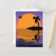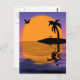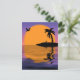 Ett vykort med tropiska solnedgångar med fågel, handflatan träd och blomma på en ö i vatten. En perfekt till Flamingo Sunset-serien.