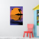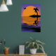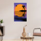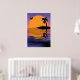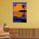 En poster av en tropisk solnedgång med en fågel, en handflatan träd och en blomma på en ö i vatten. En fortsättning på perfekten till Flamingo Sunset-serien