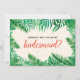 Modern frieri kort med vackra tropiska löv med vattenfärg som ger texten "[Namn], kommer du att bli min brud" i en kombination av moderna sans serif- och push-skript. Kort bakåt till en textplatshållare för meddelandet i bakgrunden.