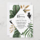 Familjen inbjudan och vänner till ditt evenemang med anpassadets tropiska inbjudan. Den här baby-välsignningsinbjudan innehåller vattenfärgsillustrationer av tropiska löv och växter med faux guld foil lövs och svart penselvattenfärgaccent. Perfekt för sommar och tropiska välsignelser. Anpassa genom att lägga till egna detaljer.