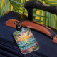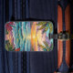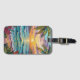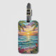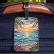 Pretty luggage tag with a gorgeous ai impasto oil painting style illustration of the blue ocean, a sandy beach surrounded by palm trees at sunset.