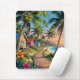 A beautiful mouse pad with a seaside tropical paradise illustration of a boardwalk along the coast, with palm trees with coconuts and strung fairy lights, blue ocean waves and small whimsical cottages.