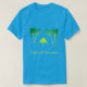 Mosaik, grafisk teckning, av en ö, med kokokosnöt träd, och hut, med texten "Tropical Summer" i flerfärgad form, nyanser av grönt, gult, brun och blå.