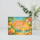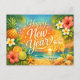 This vibrant New Year design captures a joyful tropical celebration set against a glowing ocean sunset. Warm golden light reflects across gentle waves as the sun dips below the horizon, creating a radiant orange and turquoise sky filled with sparkling star accents. Lush palm leaves, hibiscus blossoms, plumeria flowers, and fresh citrus fruits frame the composition, while seashells and a bright starfish rest along the sandy shore. Two champagne flutes raised in a festive toast complete the scene, blending island paradise charm with celebratory elegance. The rich tropical colors and cheerful details evoke warmth, relaxation, and the excitement of welcoming the new year by the sea.