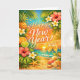 This vibrant New Year design captures a joyful tropical celebration set against a glowing ocean sunset. Warm golden light reflects across gentle waves as the sun dips below the horizon, creating a radiant orange and turquoise sky filled with sparkling star accents. Lush palm leaves, hibiscus blossoms, plumeria flowers, and fresh citrus fruits frame the composition, while seashells and a bright starfish rest along the sandy shore. Two champagne flutes raised in a festive toast complete the scene, blending island paradise charm with celebratory elegance. The rich tropical colors and cheerful details evoke warmth, relaxation, and the excitement of welcoming the new year by the sea.