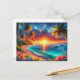 En vibrerande tropisk strandscen vid solnedgången med en färgstark himmel-övergång från blått till orange och rosa. Sol sätter sig vid horisonten och kastar en varm glöd över havet. Handflatan träd med lush grönt lämnar längs sandstranden, och deras silhuetter förstärker serenatmosfären. Delfiner hoppar till fullo ut ur vatten, silhuverterade mot strålningsbakgrunden. Ljusa blommor i nyanser av rosa, rött och blått ram i förgrunden, vilket förbättrar det idylliska landskapet. Fluffy-molnen flyter i det dramatiskt upplysta himmel och tillför djup och skönhet till scenen.