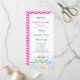 Detta färgstarka, moderna tropiska blommigt bröllop-ceremoniprogram, som innehåller handskript för trendig och elegant och färgen för rosa av bär, fribos, fuchsia, teal, turkoblått, färg, rosa, grönt och rött, är orange för paret som kommer att ha ett destinationsbröllop: på en Hawaiisk strand, ett badbröllop i Florida eller en kariaband . Vattenfärgen bilder av hibiscus, exotiska löv, paradisfåglar, tropiska blommor, ananas och handflatan träd är ett bra kort på framsidan och baksidan har en rosa av kevron mönster.
