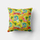Tropical throw pillow with vintage VW van, surfers, palm trees and flowers against a yellow background.