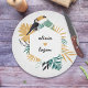 Personalized Couple Glass Cutting Board featuring an abstract toucan and tropical foliage in shades of golden yellow, green, and black.