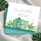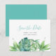 Meddela din förlovning med stil med detta eleganta "spara datum"-kort utan foto - ett idealiskt val för en strandbröllop i Florida eller något annat resmålbröllop. Med mina original handmålade akvarell tropiska blad (palm och monstera) kombinerar denna design naturlig skönhet med modern charm.