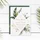Denna baby shower-inbjudan har akvarellgröna tropiska blad, palmlövmönster, bananblad med ett tropiskt lövmönster på baksidan.