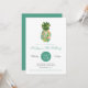 Tropiska öarnas vattenfärgade blommigt ananas, födelsedagsfest inbjudan. Söt tropiska öblommor och bladformad ananas med trendig teal och svart typografi. Kortets baksida samordnar färg med solid teal.