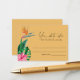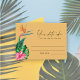 Denna färgstarka tropiska blommigt och den tropiska färg-bakgrunden inbjudningskort för möhippan. Konstruktionen har en vattenfärgad elegant buquet av klassisk strandvattenfärg, grönenergi och blommor, inklusive rosa hibiscus, orange och blåa fåglar av paradiset, grönt grey och mörk grönt handflatan löv.