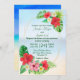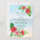 Perfekt för målbröllop eller något tropiskt tema, den här bröllopsinbjudningen innehåller ett trendig guld geometriskt ram och blandade mediefrå tropiska blommigtar. Bilderna av ljusröda och rosa hibiscus blommor och vita plumerier förskjuts av vattenfärgstropiska löv. En tropisk strand i bakgrunden fyller temat. Våldsamma hawaii på din speciella dag!