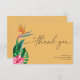 Denna färgstarka tropiska blommigt och den tropiska färg-bakgrunden inbjudningskort för möhippan. Konstruktionen har en vattenfärgad elegant buquet av klassisk strandvattenfärg, grönenergi och blommor, inklusive rosa hibiscus, orange och blåa fåglar av paradiset, grönt grey och mörk grönt handflatan löv.