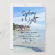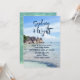Tropiska bröllopsinbjudningar. Kristallklart havsvatten och en klippig kustlinje är bilden bakom ditt valda text. Paret namn står högst upp i stor skrift. Bröllopsdatum och tid är tryckt för att sticka ut från resten av inbjudantexten. Denna soliga scen är tänkt för en liten privat sammankomst eller en avslappnad firande.