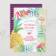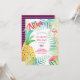 Rolig och färgglad sommar tropisk festinbjudan med vackra akvarellfrukter, flamingos och tropiska blad. Dansa hula för den största strandfesten, hawaiianska luau-festen på jorden. För matchande föremål och anpassade redigeringar kontakta Designer LeahG.