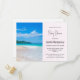 Bebisbad inbjudan vykort med ett fotografi av en fantastisk semesterplats. Ljusblå himmel, mjuk sandstrand med tropiskt kristallklart blått vatten. Ett frodigt trädbevuxet berg i bakgrunden. Scenisk och lugn fotografering.