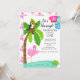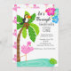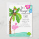 Låt oss Flamingle med denna inbjudan till första födelsedagsfesten. Det finns en flamingo som står i vattnet under ett stort, vackert palmträd med en tukan sittande i det. Anpassa med din festinformation.