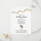 Tropisk födelsedagsinbjudan postkort, med en elegant design med palmer och strängljus på en vit bakgrund. Med anpassningsbar typsnittsbokstavering kan du lägga till din egen information. En strandinspirerad inbjudan för att planera din fest.