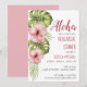 På vänstra halvan finns en akvarellmålning av tropiska blommor och blad: monstera- och palmblad och rosa hibiskus. Texten är på höger sida. Titeln "Aloha", tillfället "Rehearsal Dinner" och namnen är skrivna i en mörk rosa färg liknande hibiskusblommorna, resten är i svart. Titeln är i en handskriven stil, resten i versaler.