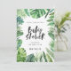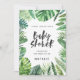 Moderna tropiska babyduschinbjudningar till handflatan löv-vattenfärgsbladet. Handmålad effektskripttext. En del av en sommarinsamling av trender. Bakgrunden till färg kan ändras.