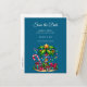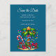 Spara datumvykortet med en bild av säsong helgdag. En tropisk träd i handflatan dekorerade i Festive ljus med en stjärna överst. En stor röd och vit candy cane som sticker ut ur sanden. Julklapp under träd. Viktigt och roligt.