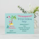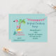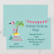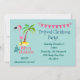 En tropisk ö-tema inbjudan till julfest. Med en söt illustration av en rosa flamingo i en röd tomtehatt. Står bredvid en grön palmkrona på en kulle av gul sand. En fin virvlande julgran design står bredvid texten God Jul. Skriven i färgen rosa med en fin handskriven stil. En rosa flaggbanner högst upp hänger över era festliga festsdetaljer. Pastellgrön bakgrund.