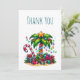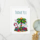 Tackkort med en säsongsbetonad helgbild. En tropisk palmträd dekorerad med festliga ljus med en stjärna på toppen. En jätte röd och vit godisstake som sticker ut ur sanden. Julklappar under trädet. Whimsisk och rolig.