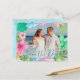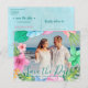 Modern akvarell bröllop spara datum tropisk blomsterkort på dammig blå med teal typografi skript med ditt foto. ------- Perfekt för ett modernt sommarhawaiianskt aloha strand, havs-, kust-, tropiskt, nautiskt eller destinationstemat bröllop.