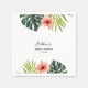 Klassisk bröllopsdusch servett prydd med akvarell tropiska motiv: monstera blad, palmblad och hibiskus blomma. Anpassa servetterna med dina detaljer för din bröllopsdusch dag. Det är enkelt och resultatet är omedelbart synligt på skärmen.
