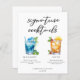 Den här tropiska namnteckning cocktails-menyn i lakan har enkel svart typografi över 2 drycker och deras ingredienser för din bröllop pub. En söt Blue Lagoon och Mai Tai teckning lägger till en coola till pub-menyn. Fyll i med parets namn och mottagningsdatum.