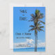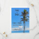 Tropisk ö, palmer, blå hav, bröllopsfest spara datumet