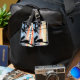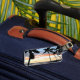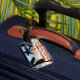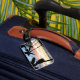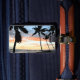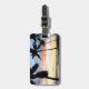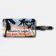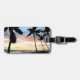 Tropiskt resa bagageIDmärkren med textmallområde för namn- och kontakttelefonnummer. Bakgrundsdesignen är en kusten med palmträd som skisseras av en livlig solnedgång.