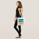 En väska med ett foto av en fantastisk semesterplats. Blått blå himmel, mjuk sandstrand med tropiskt kristallklart blått vatten. Ett lush träd täckte berget i bakgrunden. Scenfotografi och lugnande fotografi.