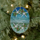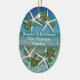 Oceanen vatten, stjärnfiskar och den första julprydnaden. Anpassa båda sidor av denna ovala, keramiska ornament för träd med tropiskt tema och malltext. Lägg till namn längst fram och all text längst bak.