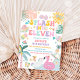 Gör en storslagen intryck med denna livfulla tropiska poolparty-födelsedagsinbjudan, perfekt för sommarfirande! Med lekfulla illustrationer av flamingo- och svanflottar, ananas, vattenmelonsskivor, solglasögon och tropiska blommor sätter den tonen för en rolig dag. Denna glada design är idealisk för barnkalas, poolpartyn eller sommarträffar och ger en färgrik och festlig stämning till din tillställning. Anpassa enkelt med detaljer om festen och imponera på gästerna med en snygg och iögonfallande inbjudan.